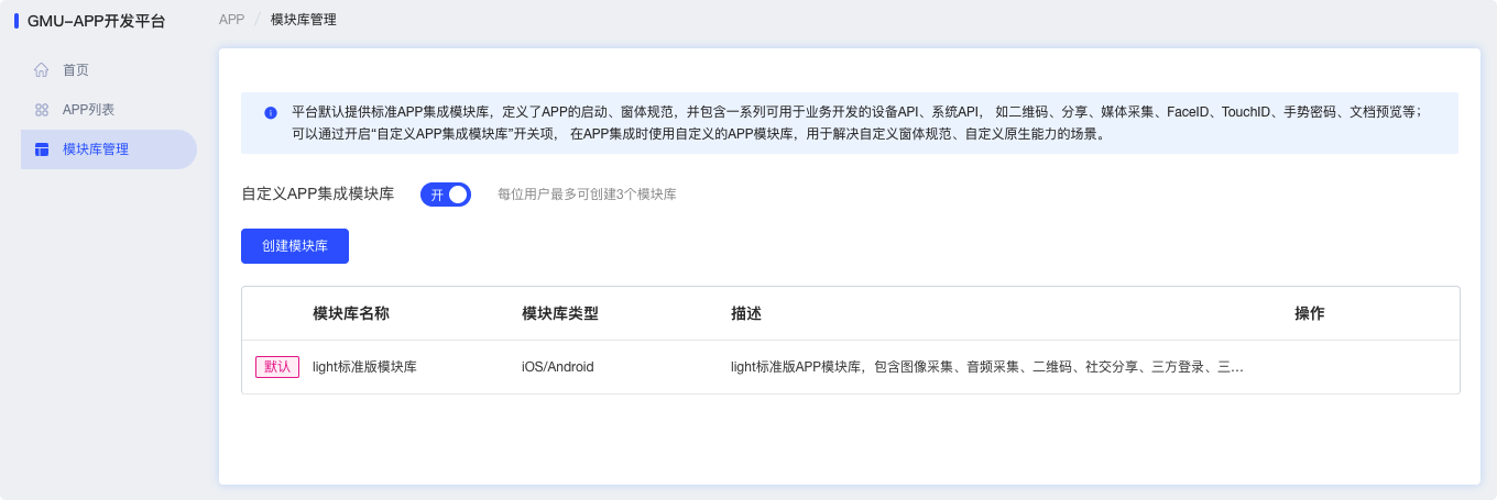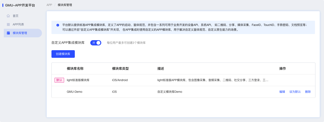 登录GMU-APP开发平台 (opens new window),进入左侧“模块库管理”菜单中,可以管理APP集成模板库。
