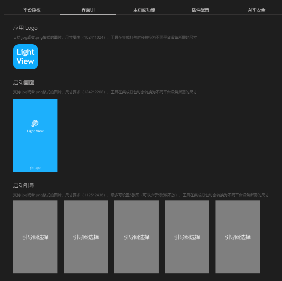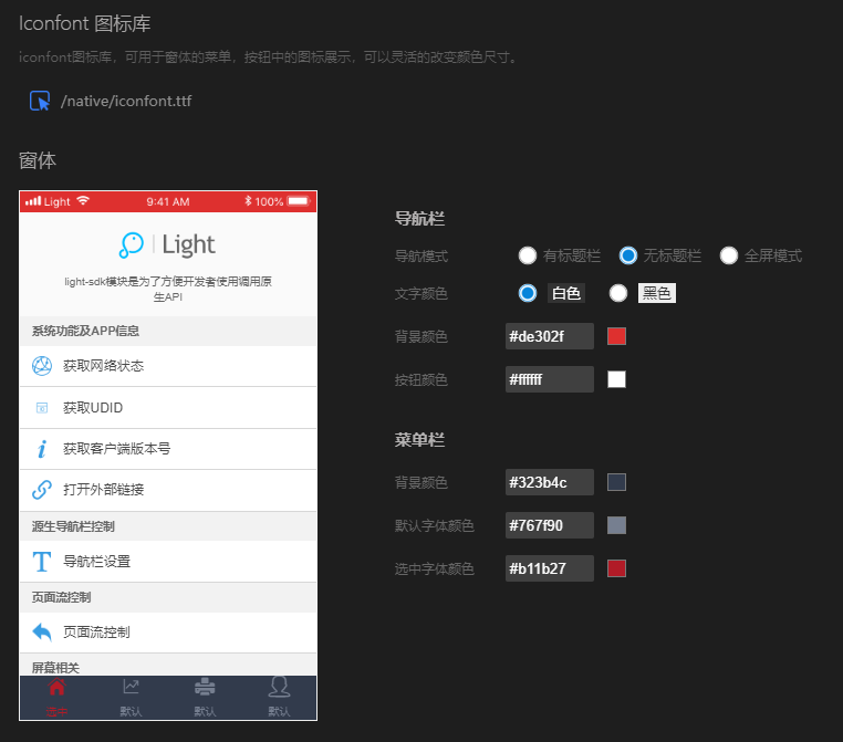 点击选择字体按钮可将字体图标文件放到工程native文件夹下,用于主页面功能中菜单的图标配置,窗体中可选择窗体导航的类型、可配置导航以及菜单的背景、字体颜色等,色值提供可输入和可选择(点击色块即可选择)2种方式。