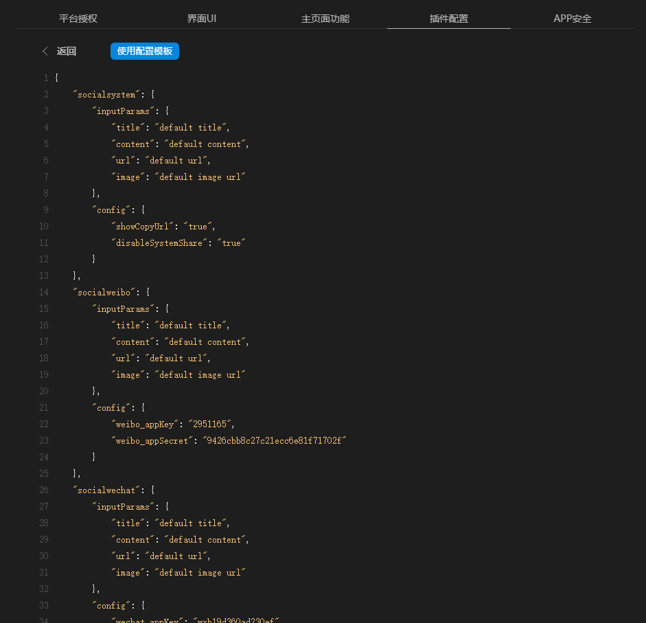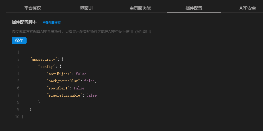 插件配置由用户按格式自由输入,输入成功后点击保存即可,点击查看配置模板按钮,可查看完整的插件配置模板。