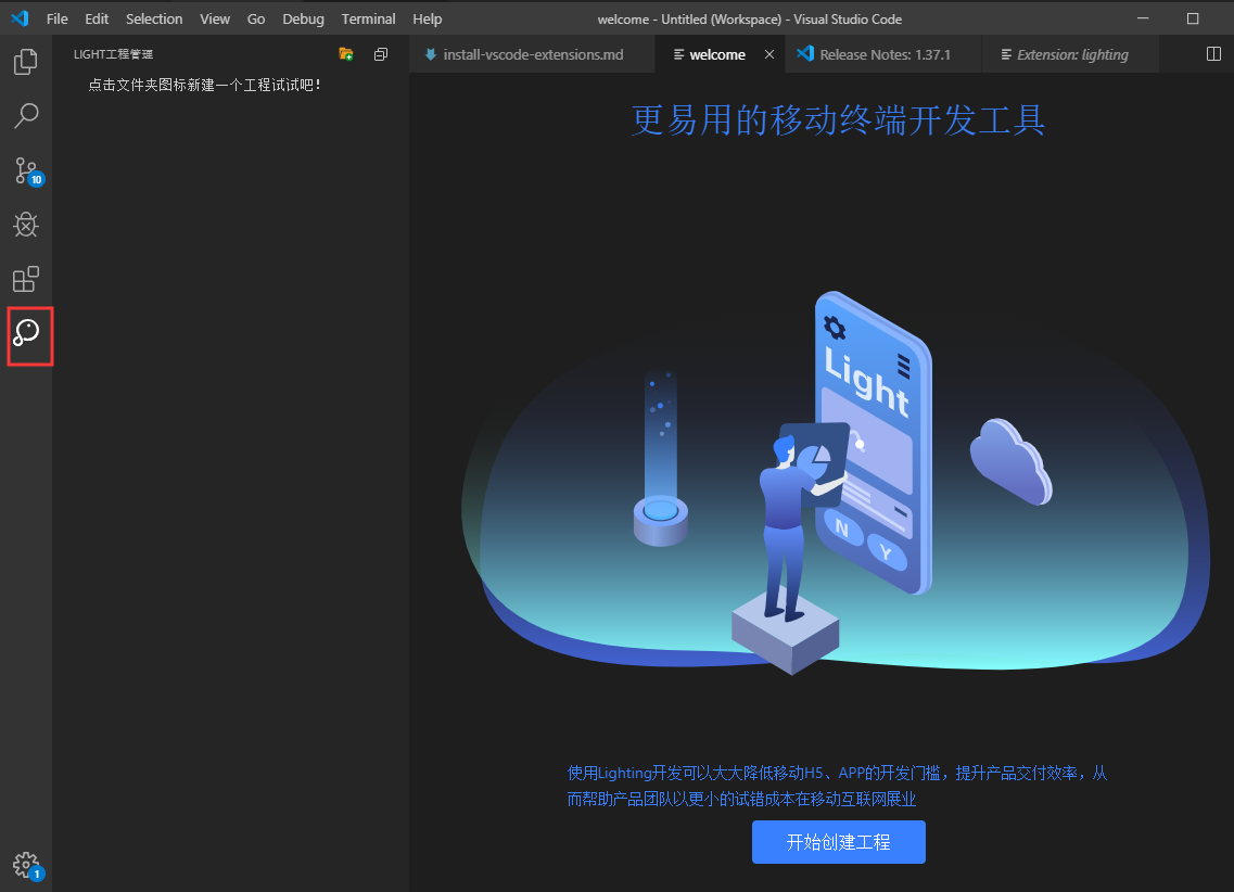 【工程创建】插件安装成功后,点击编辑器左侧的light图标,可激活插件进入Light工程管理界面,初次打开工程管理界面的时候,会出现一个欢迎页,点击按钮